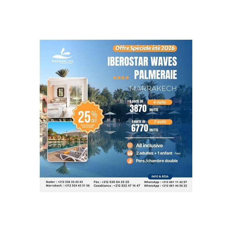 Profitez d’une offre spéciale été 2026 et vivez une expérience de détente et de luxe à Marrakech à l’hôtel Iberostar Waves Palmeraie Marrakech (4 étoiles).
