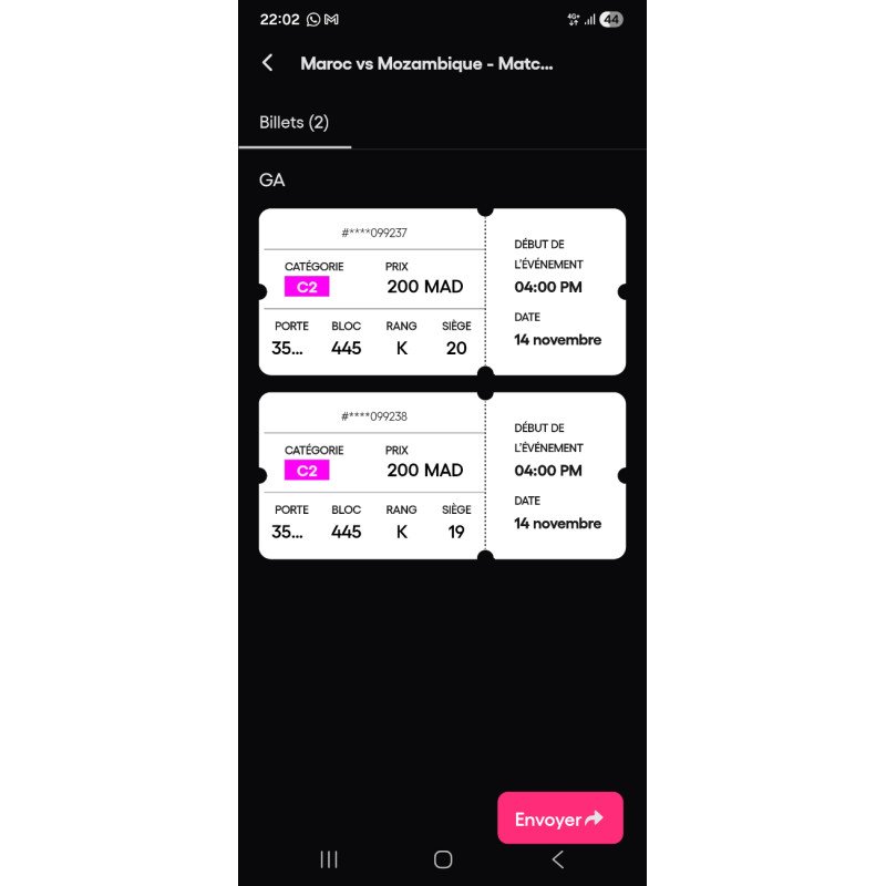 Vente de deux billets pour le match maroc vs mozambique catégorie 2 à leur juste prix 400 DH